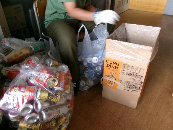 アルミ缶とスチール缶に分けます。どちらかわからないときはマグネットを使って確かめます。ビンやゴミは取り除きます。